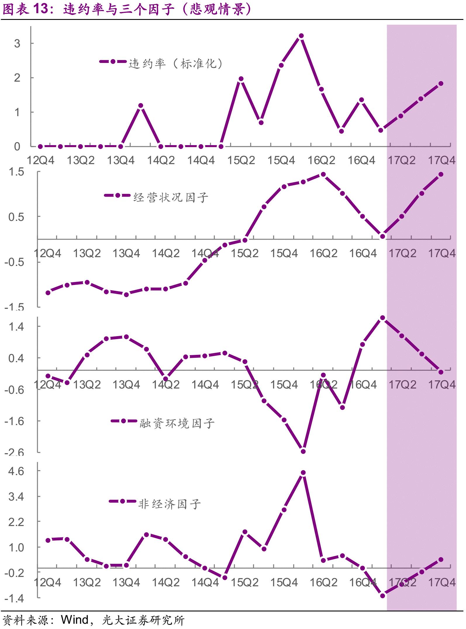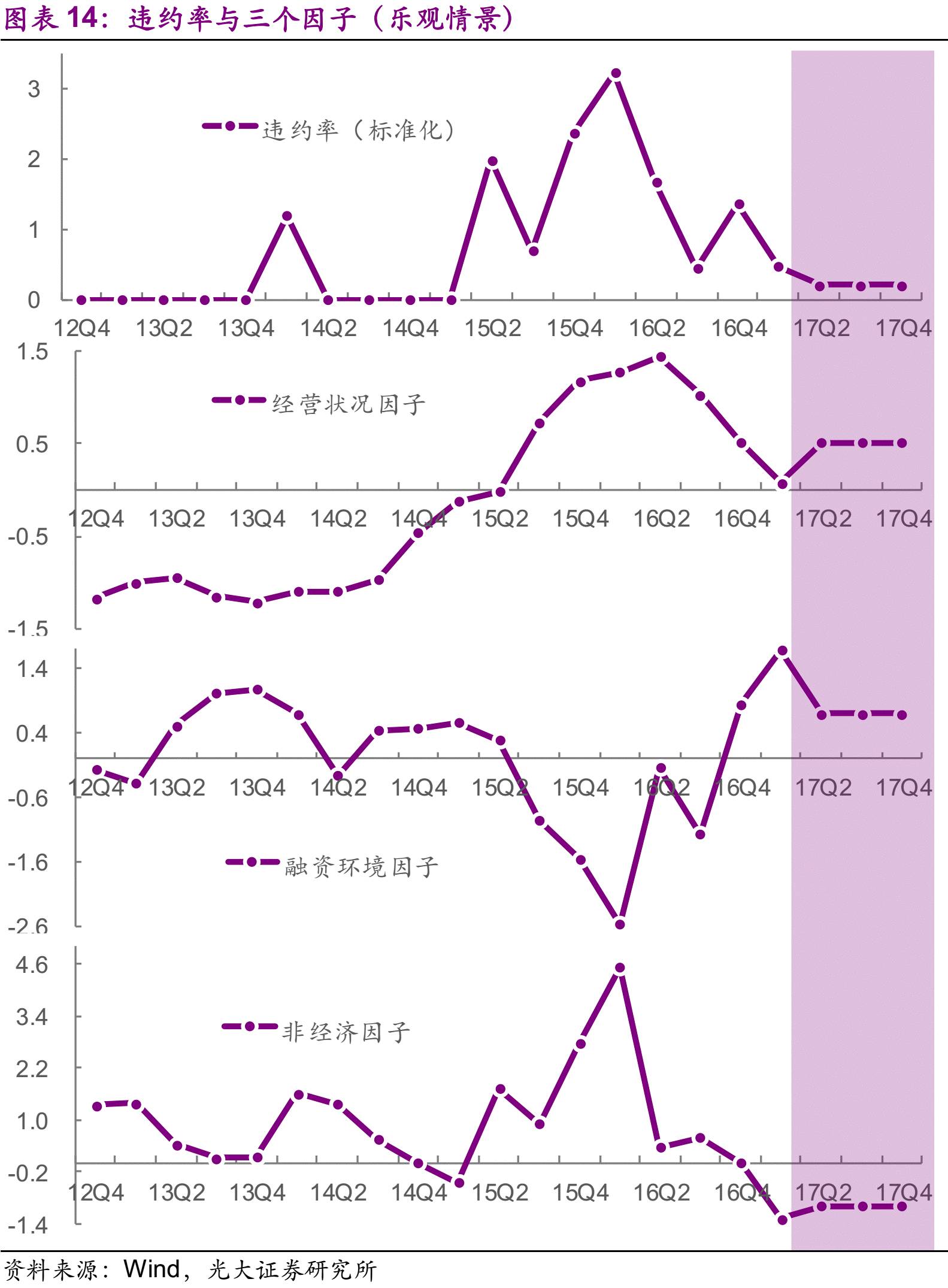 在乐观情景中,我们假设经营状况一直保持于16Q4的水平,信用债季度净发行量一直保持在7500亿元的水平,非经济因子小幅上行至-1.0。在这个情景下,单季度违约率仅仅相当于16Q3时的50%,全年违约率也仅仅为2016年的50%。