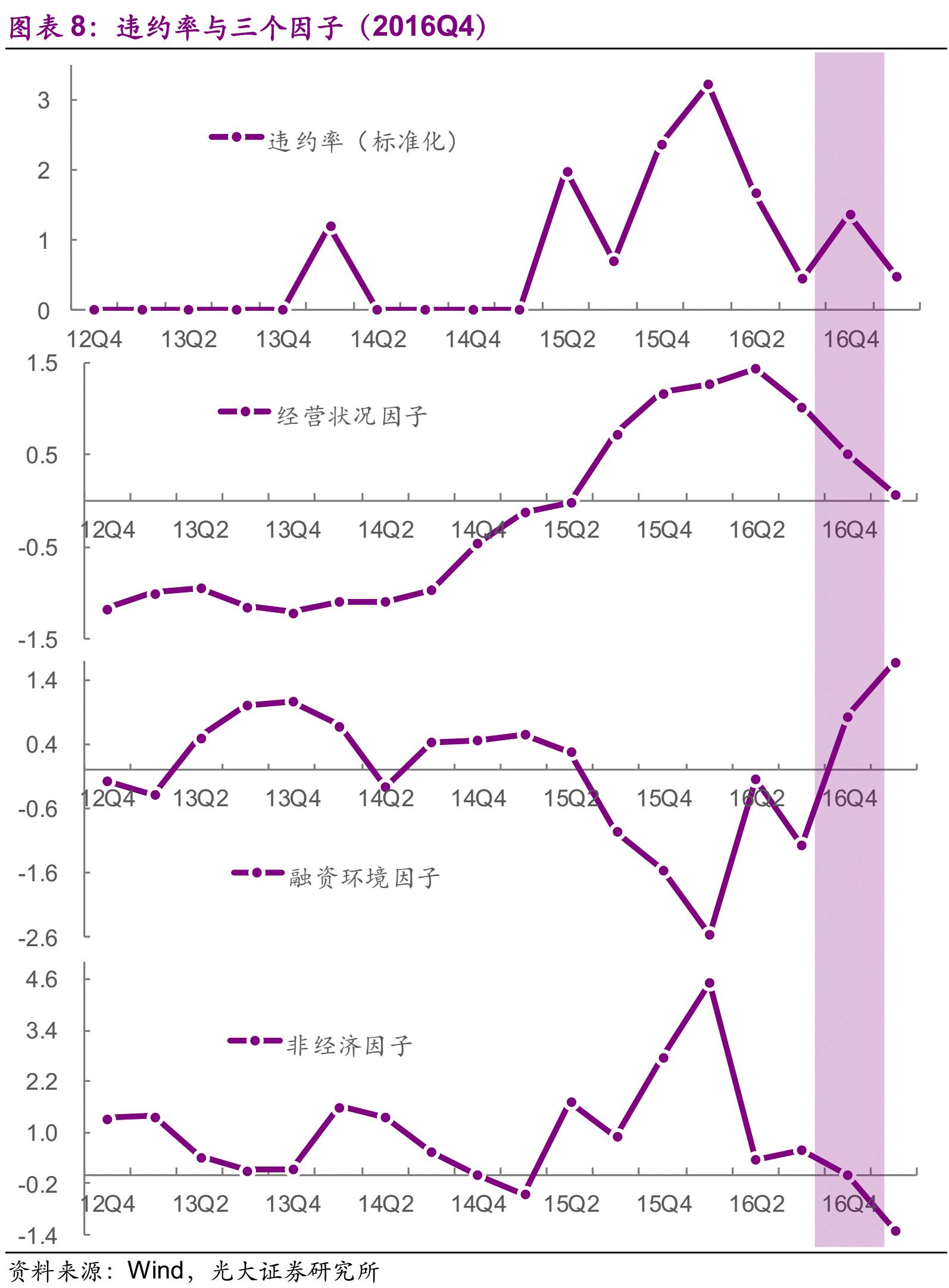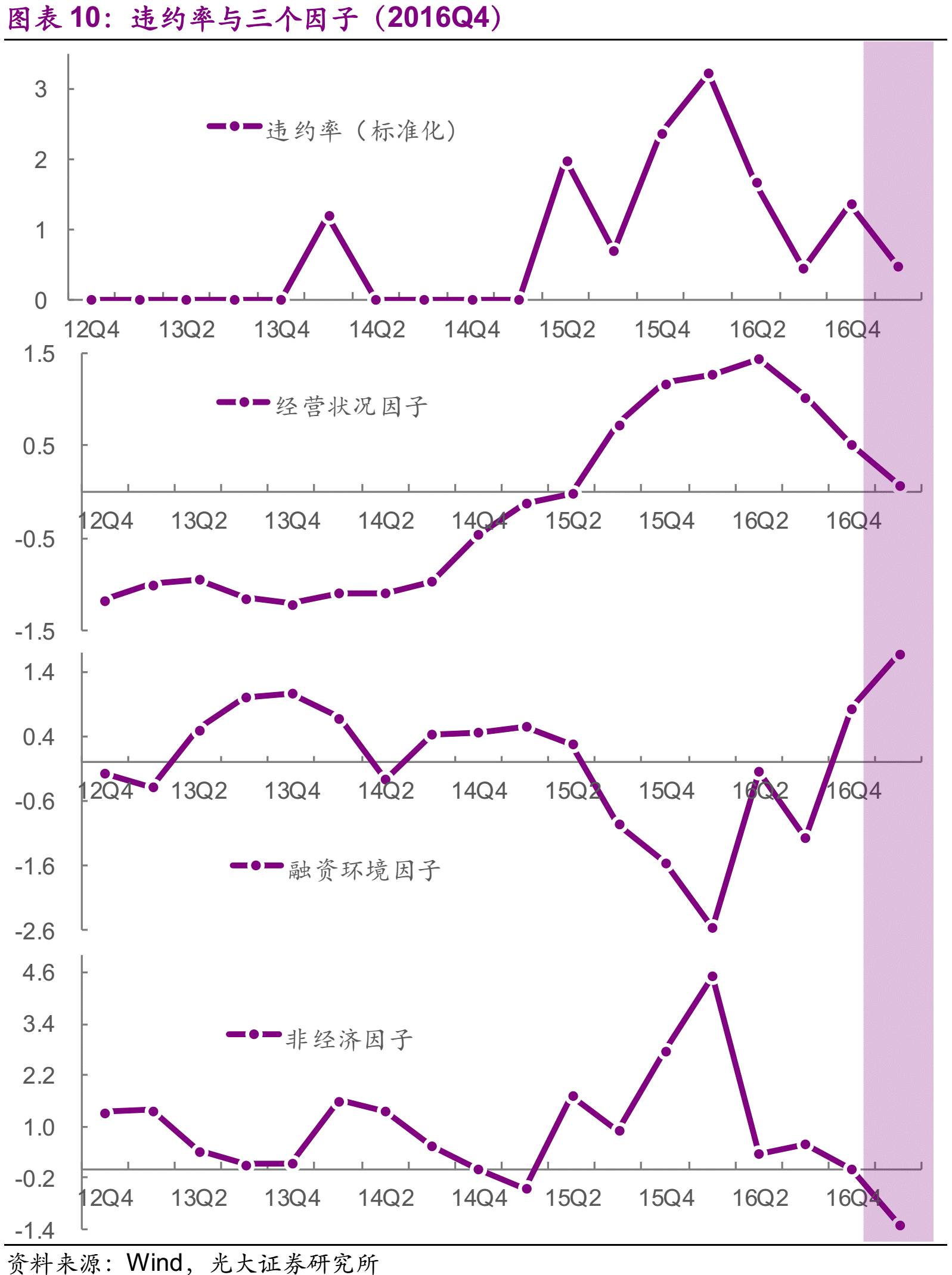 2016年四季度的违约呈现出截然不同的形态。在这个季度中,企业盈利能力上升,经营因子回落至0.70,企业内源性资金的风险显降低。但是,货币政策收紧和去杠杆进程的深化,使得资金供给受限且市场偏好上升,从而推动融资因子由-1.13快速上升至0.78。